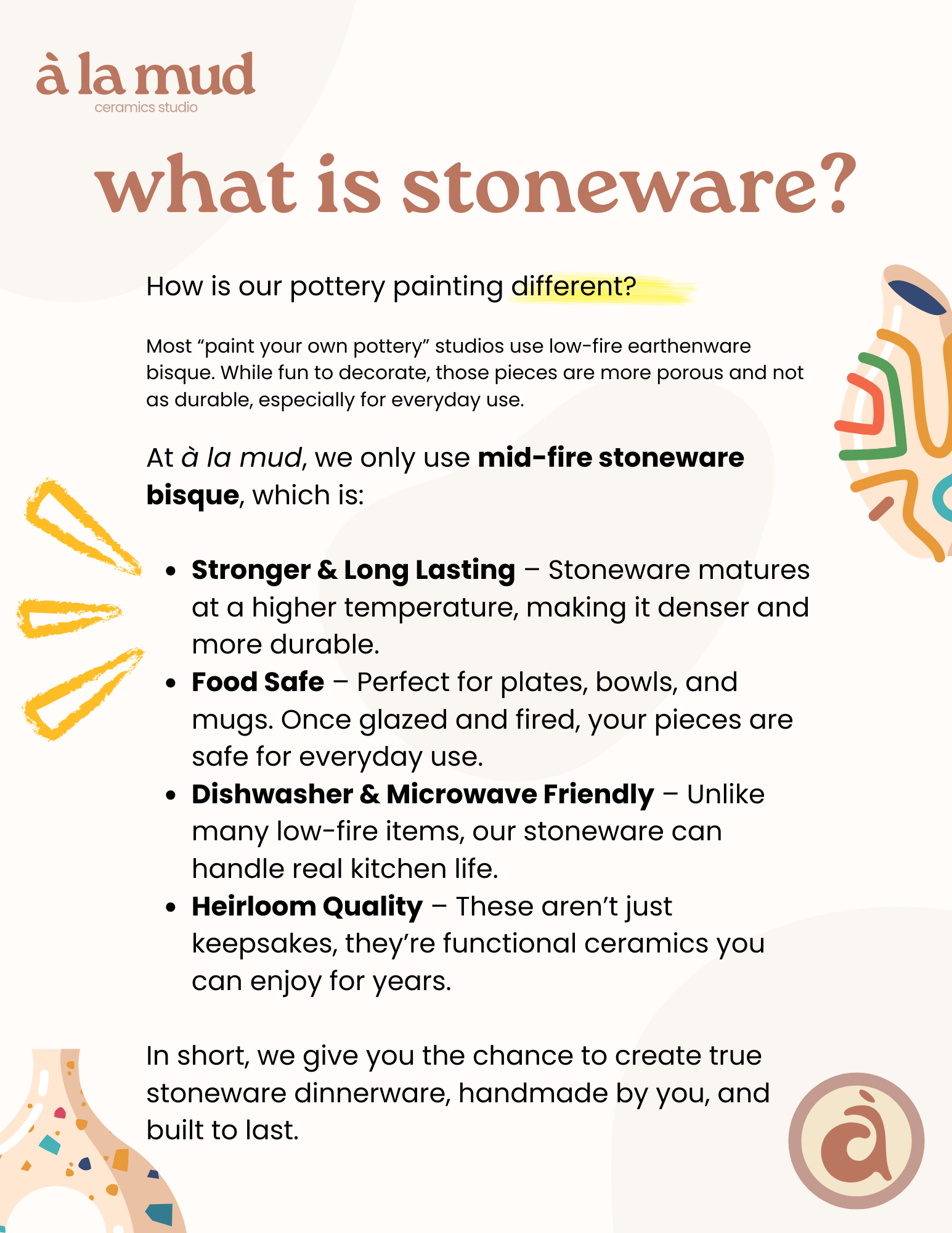 At à la mud, we only use stoneware, not earthenware. We give you the chance to create true food and dishwasher safe pieces that are built to last.